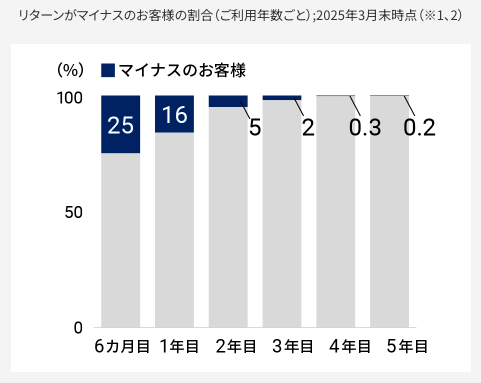 過去のデータになりますが、どのリスク許容度でも運用開始1年目以降でプラスリターンとなっています。